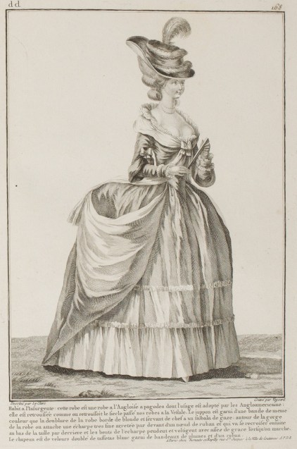 Dress à l’Insurgente: this gown is a robe à l’Anglaise with pagoda sleeves, which usage has been adopted by the Anglo-American women: it is pulled up as our robes à la Vestale were pulled up in the last Century. The petticoat is trimmed with a band in the same color of the lining of the gown, edged with blonde lace and serving as a head for the gauze flounce: around the neckline of the gown a very fine scarf is attached, held in front by a ribbon bow, and which will recross itself finally at the bottom of the waist in the back, the ends of the scarf hanging and fluttering with enough grace when one walks. The hat is of velvet, lined with white taffeta, trimmed with bands, plumes, and ribbon. (1780)