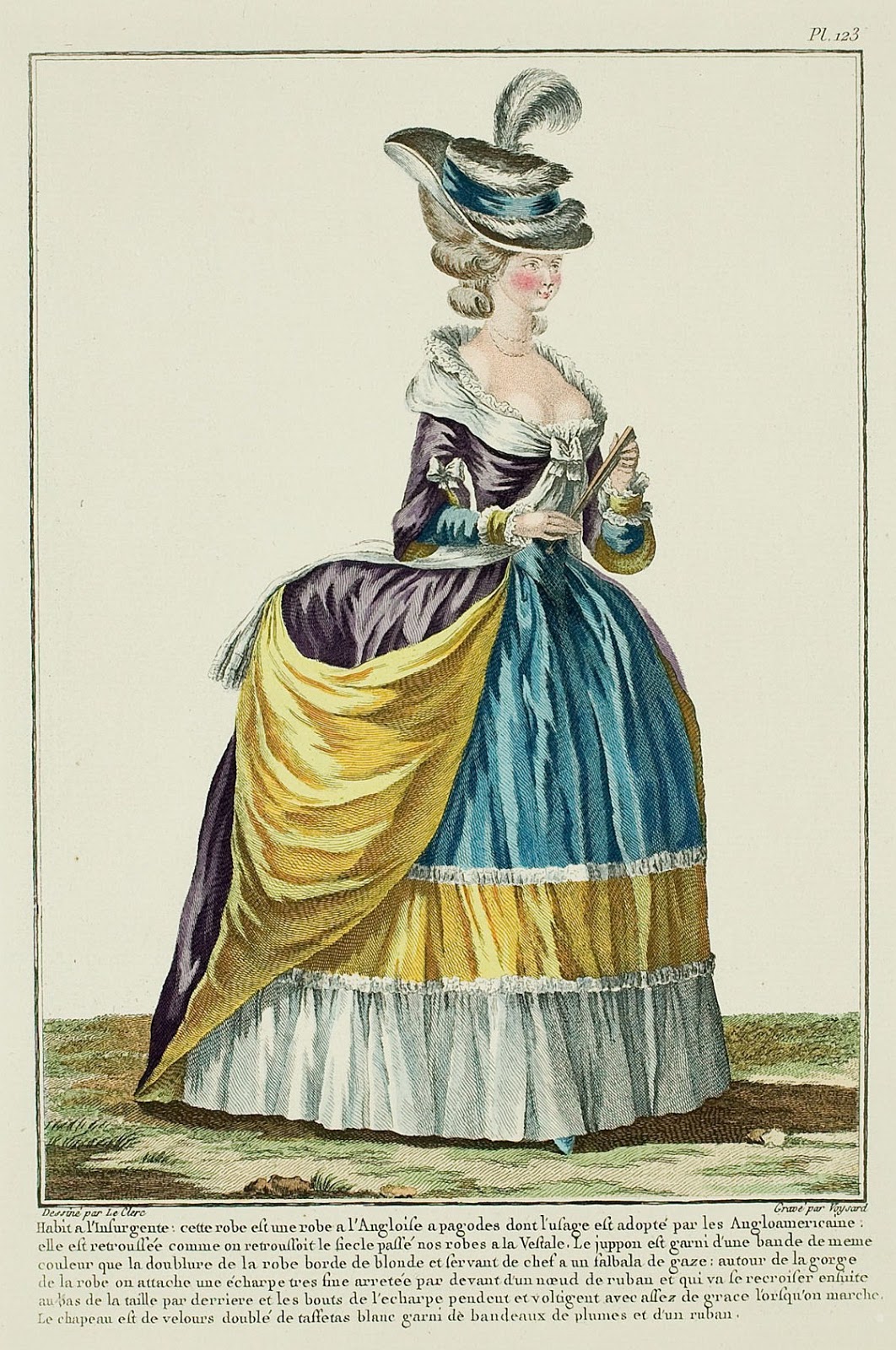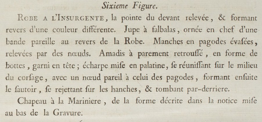 Dress à l’Insurgente: this gown is a robe à l’Anglaise with pagoda sleeves, which usage has been adopted by the Anglo-American women: it is pulled up as our robes à la Vestale were pulled up in the last Century. The petticoat is trimmed with a band in the same color of the lining of the gown, edged with blonde lace and serving as a head for the gauze flounce: around the neckline of the gown a very fine scarf is attached, held in front by a ribbon bow, and which will recross itself finally at the bottom of the waist in the back, the ends of the scarf hanging and fluttering with enough grace when one walks. The hat is of velvet, lined with white taffeta, trimmed with bands, plumes, and ribbon. (1780)