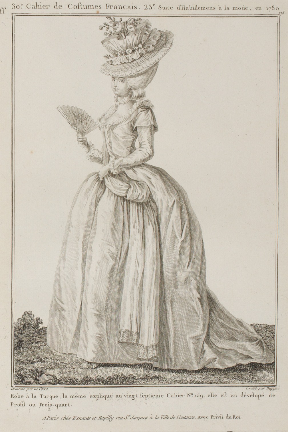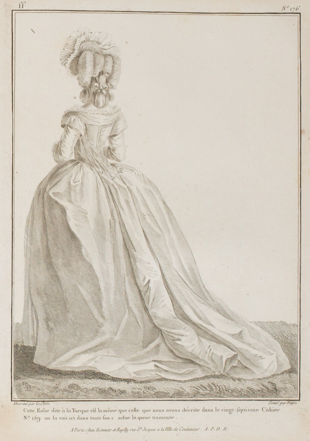 This Gown, called à la Turque, is the same which was described in the twenty-seventh Book, p. 159; it is seen here in all its length, the tail training. (1780)