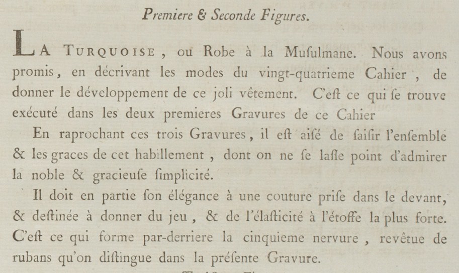The Turquoise, or Robe à la Musulmane. We have pledged, in describing the fashions of the twenty-fourth Book, to give the view of this pretty dress. It is that which is found executed in the first two Prints of this Book.