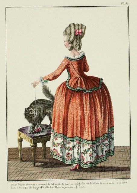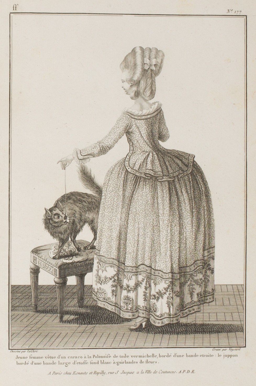 Young woman dressed in a caraco à la Polonaise of vermicelli linen, edged with a narrow band; the petticoat edged with a wide band of fabric with a white ground with garlands of flowers. (1780)
