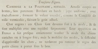 Angora cat: these Cats have become very fashionable, and have multiplied with a surprising rapidity. Their appearance in France has almost entirely made caniche or long-silk dogs fall out of fashion; but the mobility of fashions, the difficulty of taking cats places, will soon bring back the reign of the little dogs to carry under the arm.