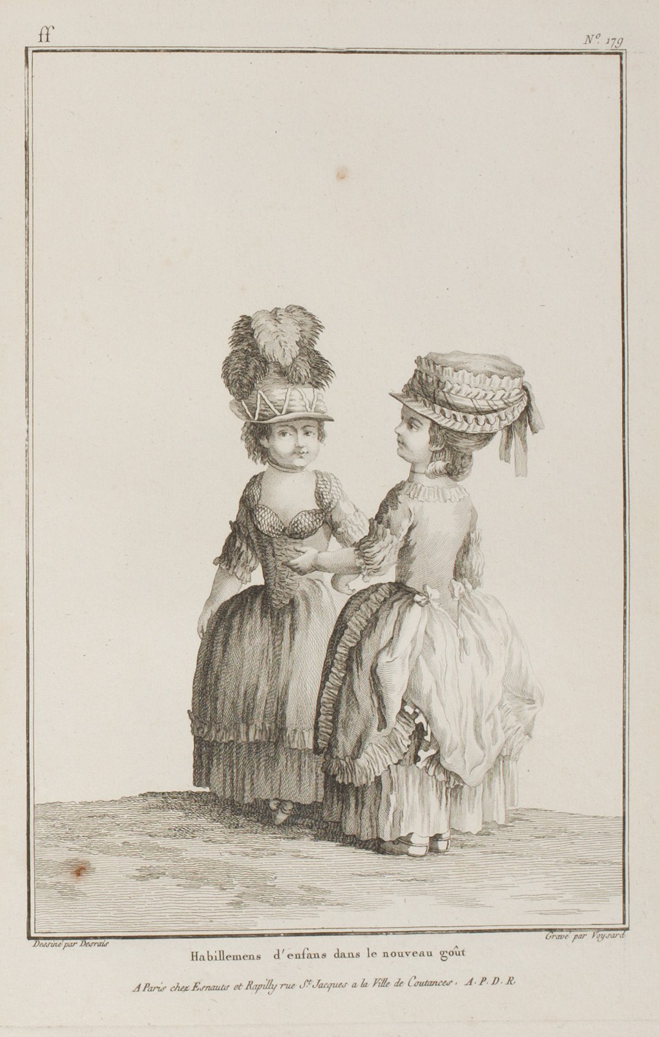 CHILDRENS FOURREAUX. This Plate represents two little Girls, dressed in modern style; the one, seen from the front, is dressed in a plain Fourreau, trimmed with sabot cuffs and a linen volant, with a bouffante of filet lace pinched in a coque serving as a tour-de-gorge; a straw hat, en casque,* on the head.