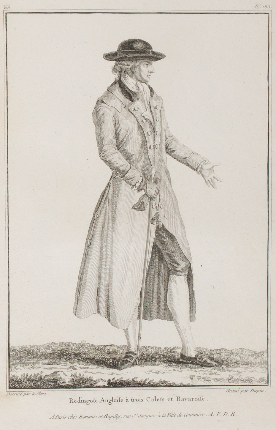 Gilet with bavaroises, crossing on both sides; breeches of cloth of black silk. Hat à la Charbonniere, trimmed with its bourdaloue buckled in front.* The hat of a fashionable color: these colors have been grey, puce, tiger-orange, etc.