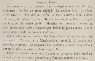 LÉVITE REDINGOTE. These Redingotes have succeeded the Backmanns, and make the grand négligé. The color light blue has been affected to them: they must have the short cut, three scalloped collars, situated in tiers. Revers separated from the collar, held with self-fabric buttons. Sleeves en fourreau, having a little parement en botte, opening underneath to the elbow; the whole edged with a gance of a matching color.