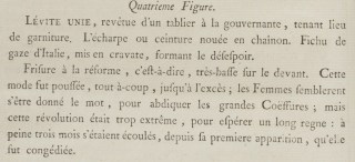 Hairstyle à la réforme, that is to say, very low in the front. This fashion was pushed, all of a sudden, to excess; Women seemed to have passed the word to abdicate the grand Coiffures; but this revolution was too extreme to hope for a long reign: scarcely three months are passed since its first appearance, then it was dismissed.