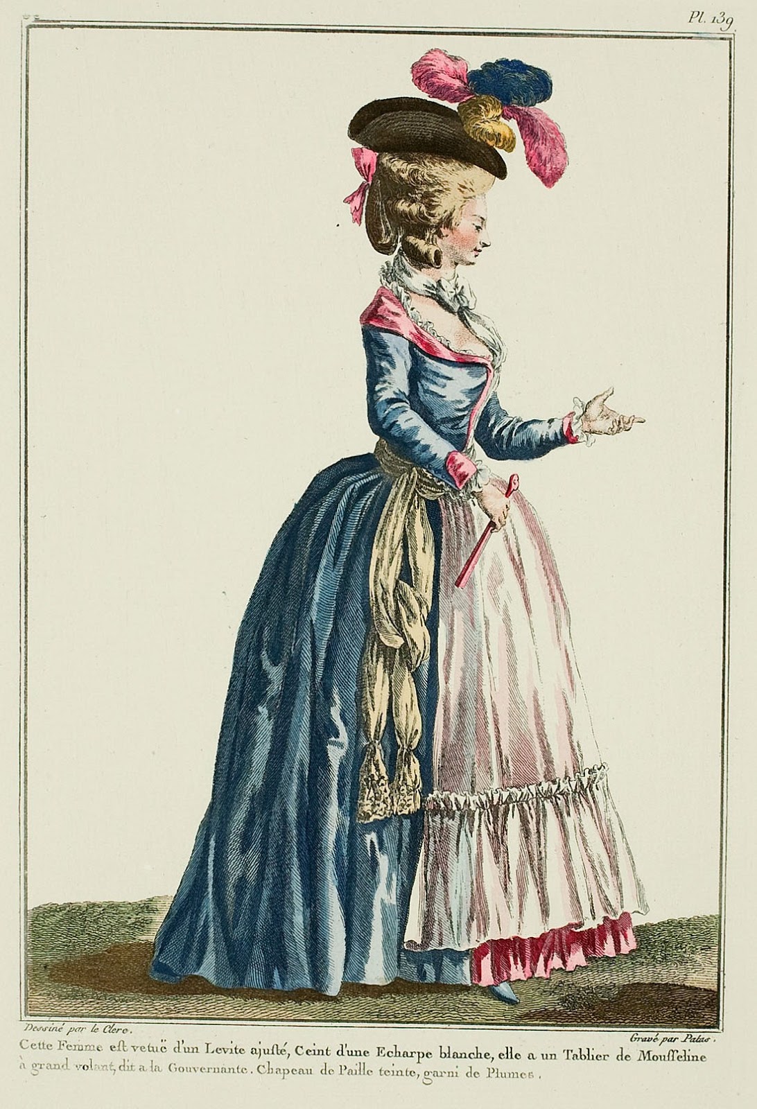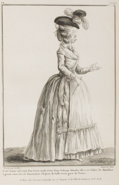This Woman is dressed in a fitted Levite, Belted with a white Scarf, she has a Muslin Apron with a large volant, called à la Gouvernante. Hat of tinted straw, trimmed with Plumes. (1780)