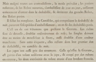 It is one of these garments that is presented in the Print. The rich ones are made of lace, ordinarily lined with pink; the simple ones must be at least of flowered muslin, also lined with a contrasting color. Without this etiquette, they remain in their first state of deshabillé, or are a night camisole.