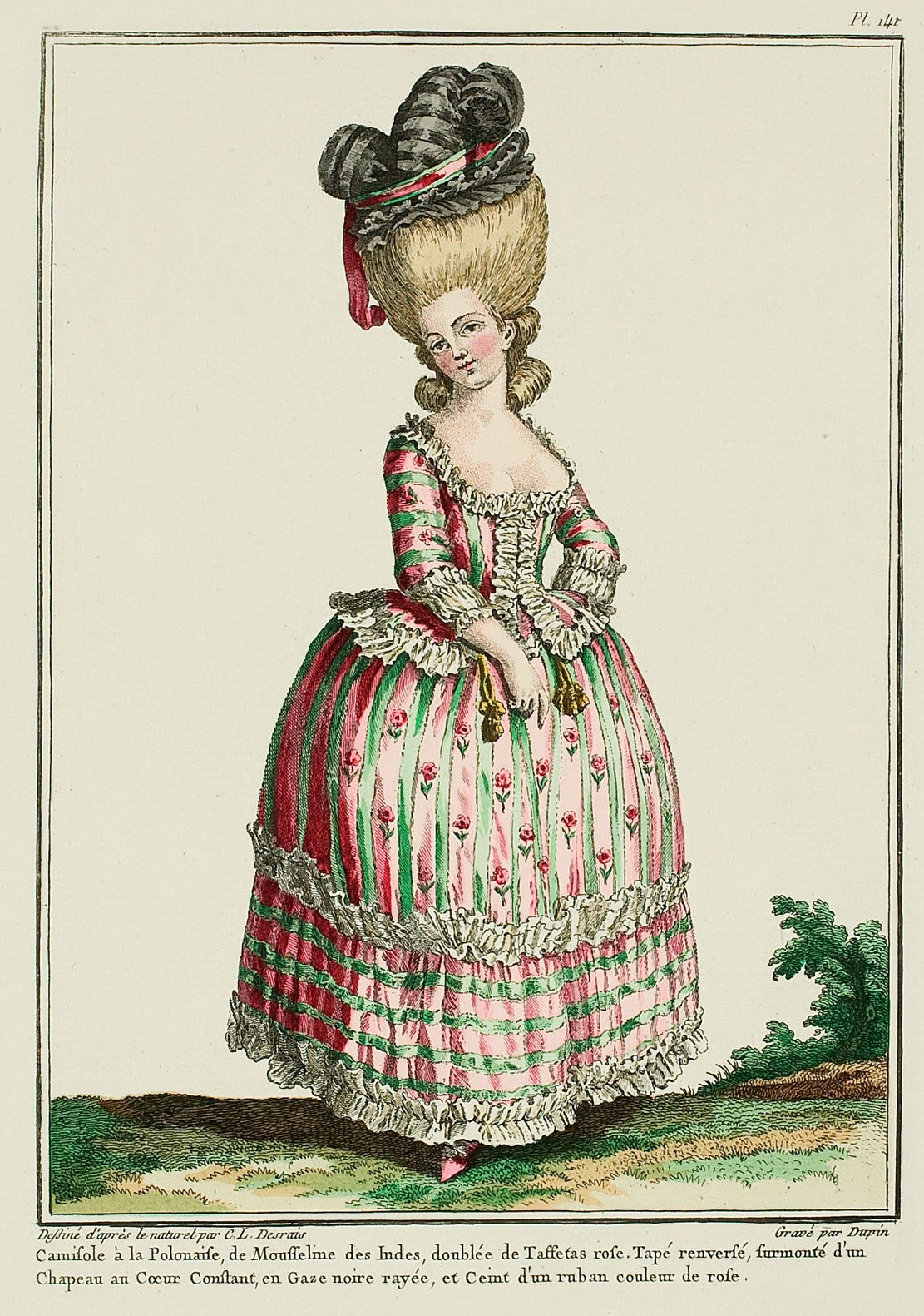 CAMISOLE A LA POLONAISE. The camisole was, in the past, nightwear for Women. The open Gowns, that are worn at present in the fullest dress, were what one called deshabillés: they were named Robes de chambre.* It is true that they were without trimming, but as they were, they were never seen outside, and made the pendant of the Robes de chambre or Men’s deshabillé of which we spoke in the previous article.