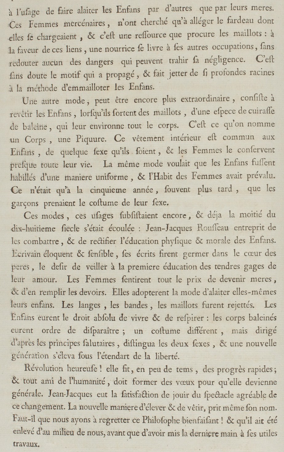 Happy revolution! it made, in a little time, rapid progress; and every friend of humanity must wish that it becomes general. Jean-Jacques had the satisfaction of making the agreeable spectacle of this change. The new manner of raising and dressing even took his name. We must miss this beneficent Philosopher! and that he has been raised from our midst before having put the last hand to his useful works.