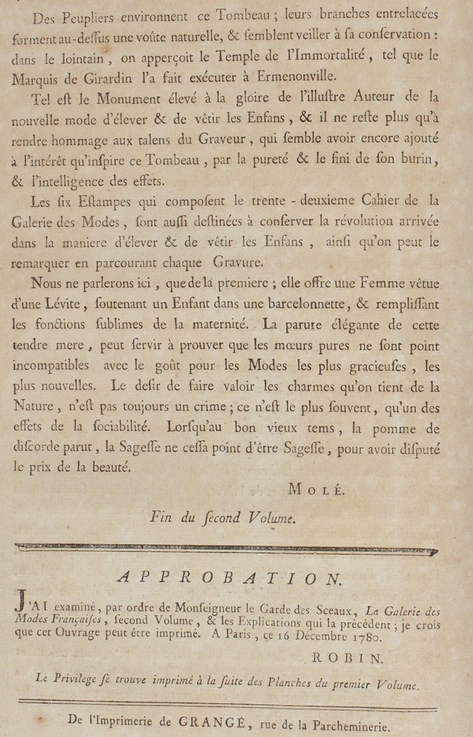 I have examined, by order of Monseigneur the Keeper of the Seals, La Galerie des Modes Françaises, second Volume, and the Explanations which precede it; I believe that this Work may be printed. In Paris, this 16 December 1780.