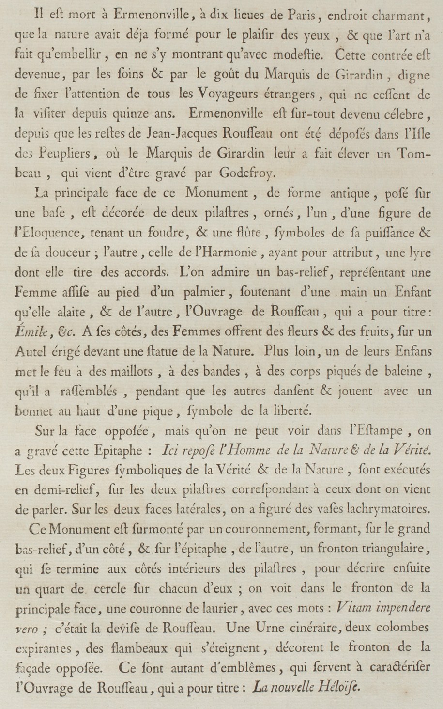 This Monument is surmounted by a crown, forming, on the great bas-relief, on one side, and on the epitaph, of the other, a triangular pediment which ends on the inner sides of the pilasters, to describe them a quarter circle over each of them; one sees in the pediment of the principal face a laurel wreath with the words: Vitam impendere vero [To devote one’s life to truth]; this was Rousseau’s motto. A cinerary Urn, two dying doves, extinguished torches decorate the pediment of the opposing façade. These are many emblems which serve to character the Work of Rousseau which is titled: The New Heloise.