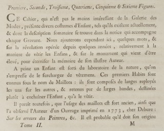 This Book, which is no less interesting than the Galerie des Modes, presents diverse clothing for Children, which actually exist and whose summary descriptions are found in the captions which accompany each Print. We add here, however, some words, and on the revolution carried out over several years, relative to the manner of dressing Children, and on the monument which was just raised to eternize the memory of its illustrious Author.
