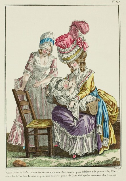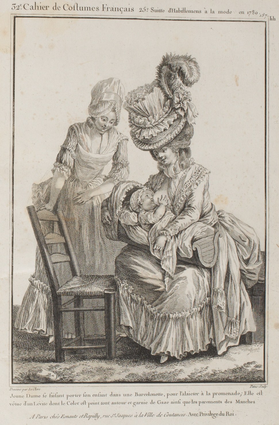 Young Lady carrying her child in a Cradle to breastfeed while walking. She is dressed in a Lévite whose Collar is painted all around and trimmed with Gauze, as are the parements of the Sleeves. (1780)
