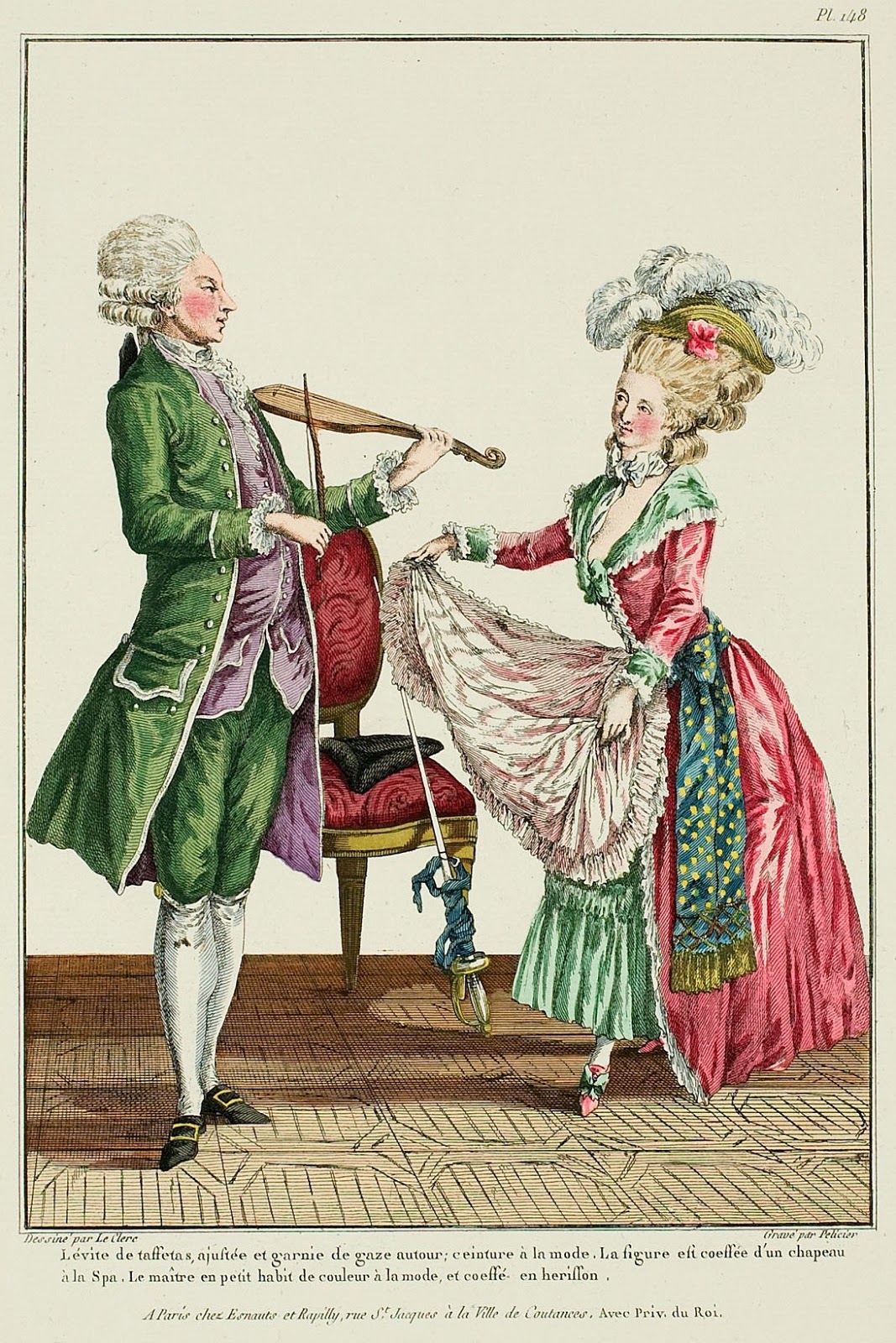 Taffeta lévite, fitted and trimmed with gauze around it; fashionable belt.  The woman is coiffed with a Spa hat.  The dancing master in an informal suit in the fashionable color, and coiffed en herisson. (1780)