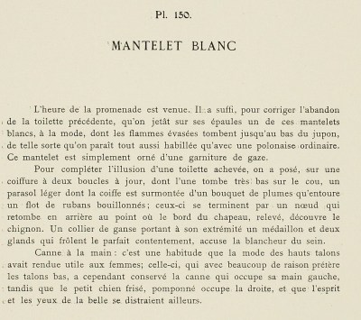 Walking time has arrived. It sufficed, to correct the abandon of the preceding toilette, to throw one of these fashionable white mantelets, whose flared points fall almost to the bottom of the petticoat, over the shoulders, such that one seems as dressed as in an ordinary polonaise.* This mantelet is simply decorated with a gauze trim.