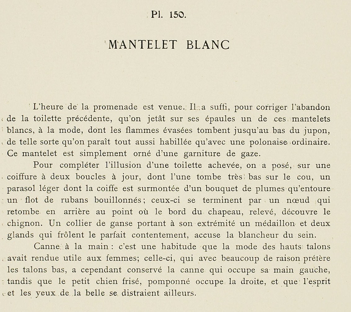 Walking time has arrived. It sufficed, to correct the abandon of the preceding toilette, to throw one of these fashionable white mantelets, whose flared points fall almost to the bottom of the petticoat, over the shoulders, such that one seems as dressed as in an ordinary polonaise.* This mantelet is simply decorated with a gauze trim.