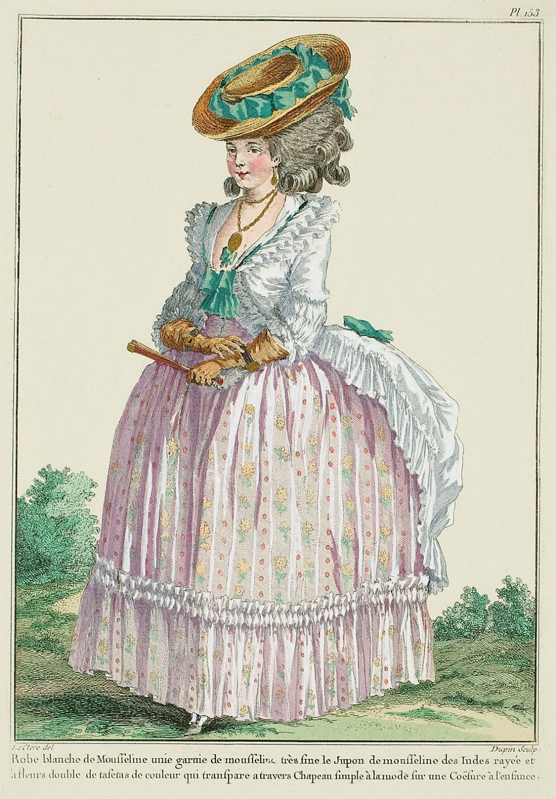 White gown of plain Muslin trimmed with very fine muslin; the Petticoat of striped and flowered Indian muslin lined with colored taffeta which can be seen through [the muslin]. Simple fashionable hat on a coiffure à l’enfance. (1780)
