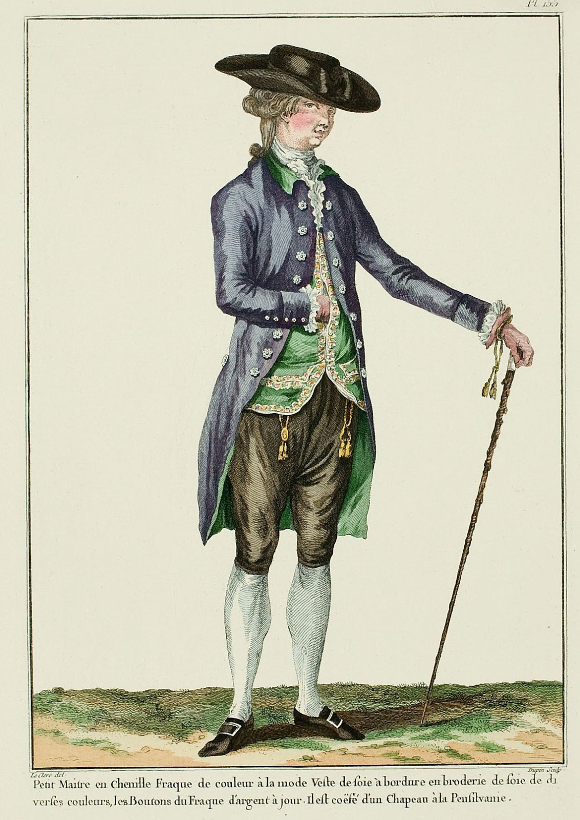 * “Déshabillé that young people put on in the morning and which consists of a rateen or coutil frock coat, a black or white taffeta cravat, hair in a queue or pulled up with a comb, long breeches known under the name of pantaloons, or artistically worked brodequins.” (CARACCIOLI, Dictionnaire critique, 1776)
