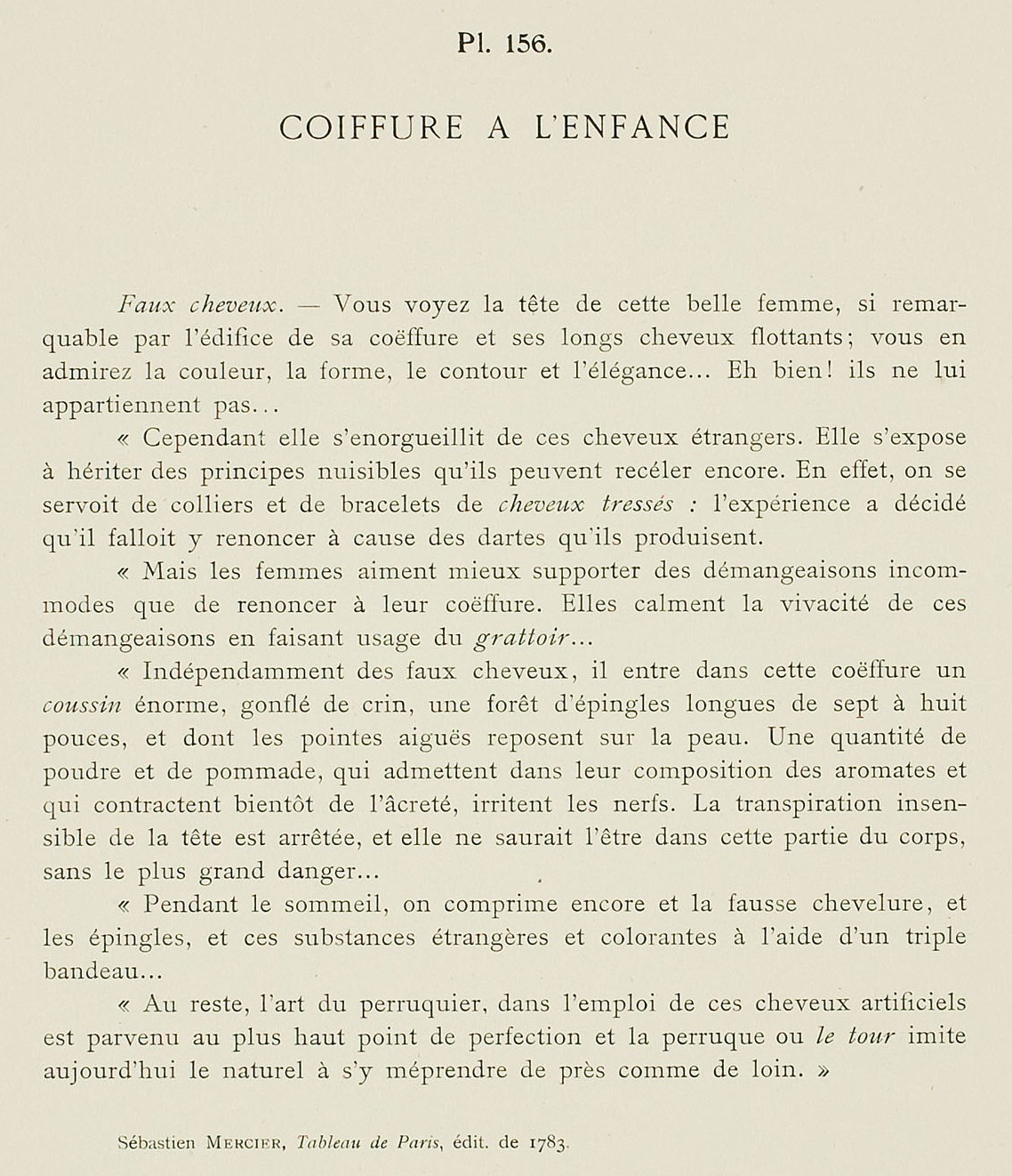 “Independently of false hair, there is used in this coiffure an enormous cushion, stuffed with horsehair, and a forest of long pins seven or eight inches long, and whose sharp points rest on the skin. A quantity of powder and pomade which use aromatics in their compositions and which soon contract acridity, irritate the nerves. The insensitive sweat of the head is stopped, and it cannot be in this part of the body, with the greatest danger …