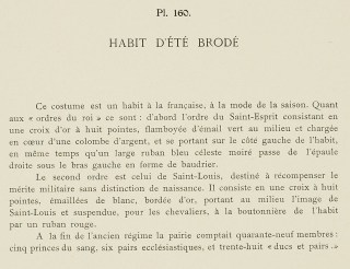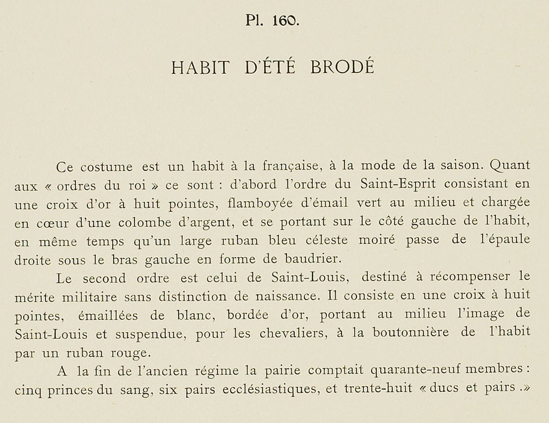 This costume is a suit à la française, in the fashion of the season. About the “orders of the king”, they are: first the order of St. Esprit, consisting of a gold cross with eight points, flaming with green enamel in the middle of and topped en coeur with a silver dove, and is worn on the left side of the suit, at the same time as a wide sky-blue moiré ribbon passes over the right shoulder under the left arm, in the form of a baldric.