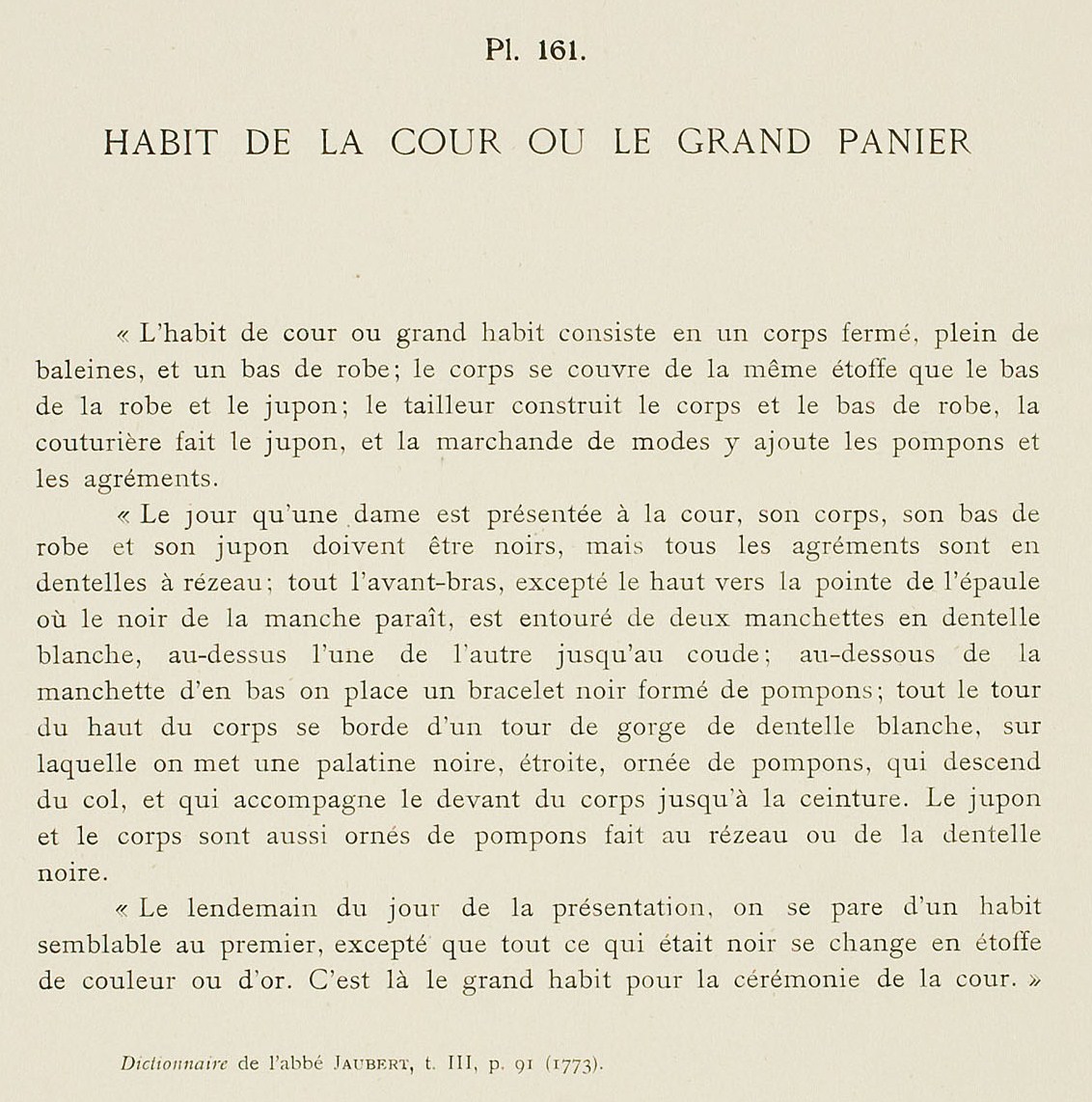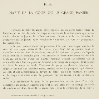 “The court dress or grand habit consists of closed stays, fully boned, and a gown skirt; the stays are covered with the same fabric as the bottom of the gown, the seamstress makes the petticoat, and the marchande des modes adds the pompoms* and trimmings to it.
