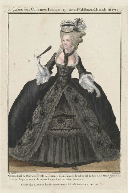 Full Court mourning, adjusted, with tied Coiffure. According to etiquette the gown is of Raz de S. Maur, trimmed with Gauze in drapery tied with ribbons on a ground of bouillonné crêpe. (1781)