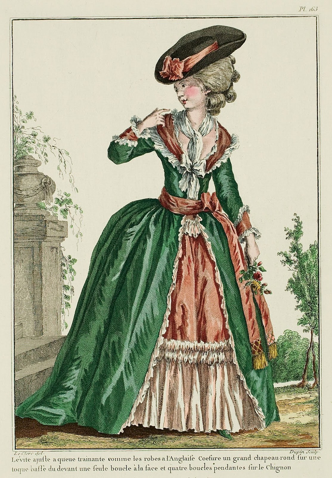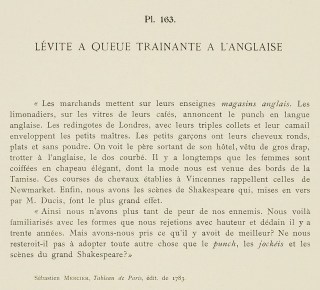 “Merchants put up on their signs English shops. The lemonade sellers, on the windows of their cafés, announce their punch in the English language. London redingotes, with their triple collars and their capes which envelop the little masters. Little boys have their hair round, flat, and without powder. The father is seen exiting his hotel, dressed in thick wool, trotting in English fashion, the back curved. It has been a long time that women have been coiffed with elegant hats, whose fashion came to us from the banks of the Thames. Those racetracks established at Vincennes recall those at Newmarket. Finally, we have scenes from Shakespeare which, put into verse by M. Ducis, made the greatest effect.