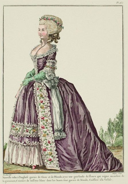 New robe a l’Anglaise trimmed with Gauze and Blonde lace, with a garland of flowers which covers the middle of the trim. Belt of white taffeta whose ends are trimmed with blonde lace. Coiffure a la Vestale. (1782)