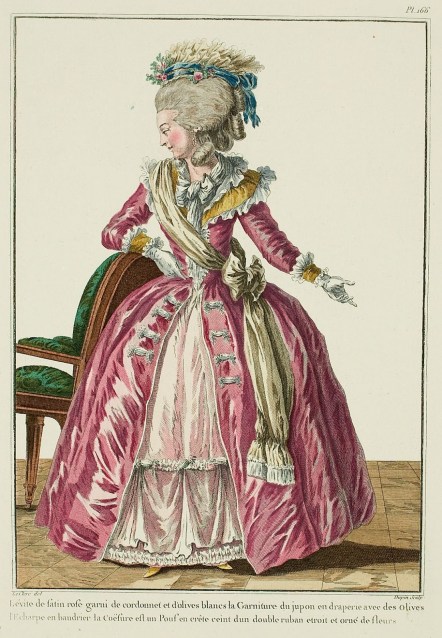 Gloves. – “Gloves did not cease to be an indispensable accessory of the toilette. Abbe Jaubert, in his Dictionnaire, notes (1773) that “one wears them in all seasons and women above all can hardly do without them.” He enumerates the types of leather from which they are made: chamois, goat, sheep, lamb, suede, deer, elk, etc. and which never hinders the industry of silk, thread, wool, or cotton gloves, that are done as a trade,* nor that of gloves of velvet, satin, taffeta, linen, and other fabrics.
