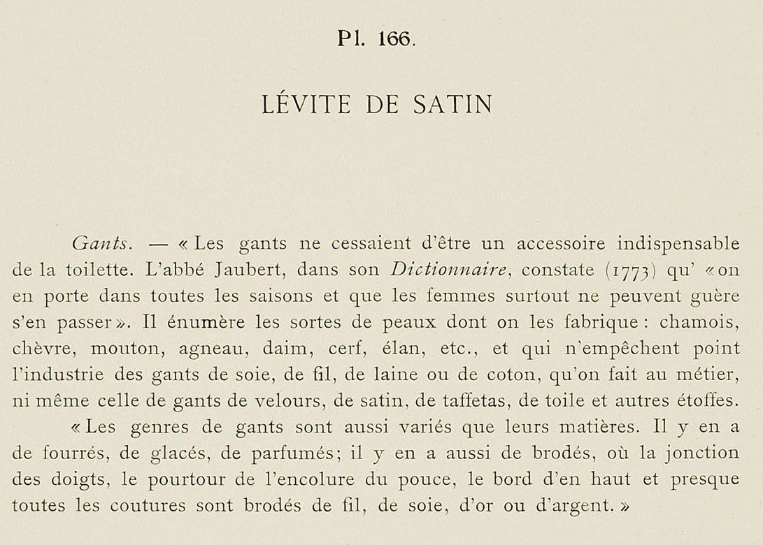 Gloves. – “Gloves did not cease to be an indispensable accessory of the toilette. Abbe Jaubert, in his Dictionnaire, notes (1773) that “one wears them in all seasons and women above all can hardly do without them.” He enumerates the types of leather from which they are made: chamois, goat, sheep, lamb, suede, deer, elk, etc. and which never hinders the industry of silk, thread, wool, or cotton gloves, that are done as a trade,* nor that of gloves of velvet, satin, taffeta, linen, and other fabrics.