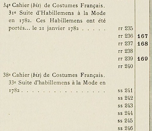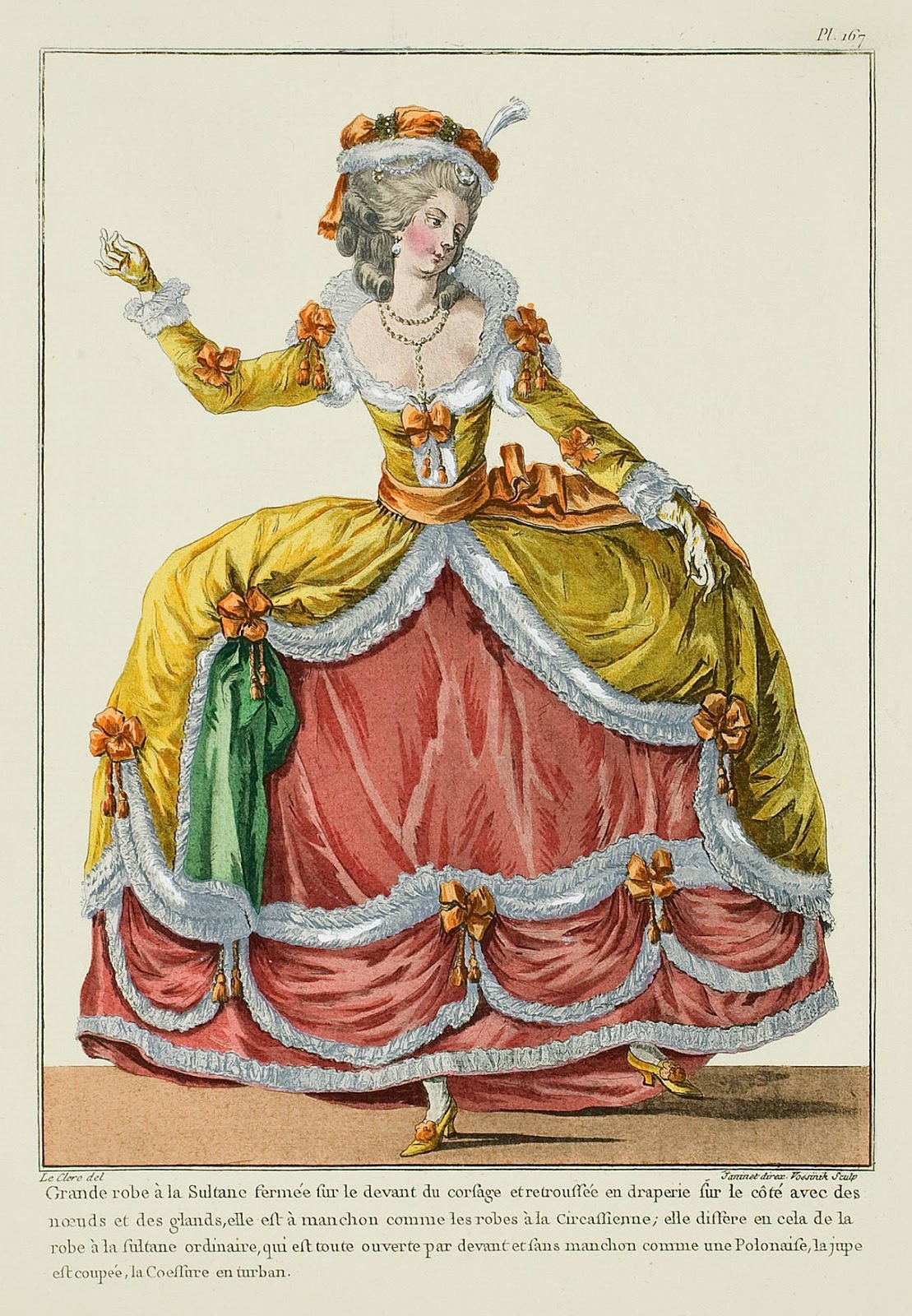 “There was a very appreciated gown trimming in the winter, of fur bands. But outside of cloaks and mantelets (see plates 25, 59, 70, for example), they could hardly be applied on the surface of court gowns (plate 46). The preference was for marten, black fox; squirrel, beaver; ermine had as much success, and in 1768, for the half-mourning imposed for the death of the queen, the Courrier de la Mode taught that one used ermine skins ‘colored with large and small stripes and in other patterns for different tastes’.”