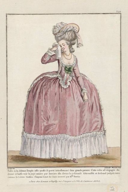 Simple robe à la sultane, such as is actually worn without a grand parure. This gown is open in front and allows the whole petticoat to be seen; in the back it has the form of an untied polonaise and descends almost to the ground like the Lévite. Hat coiffure with a cap of Gauze invented by Mlle Bertin. (1782)
