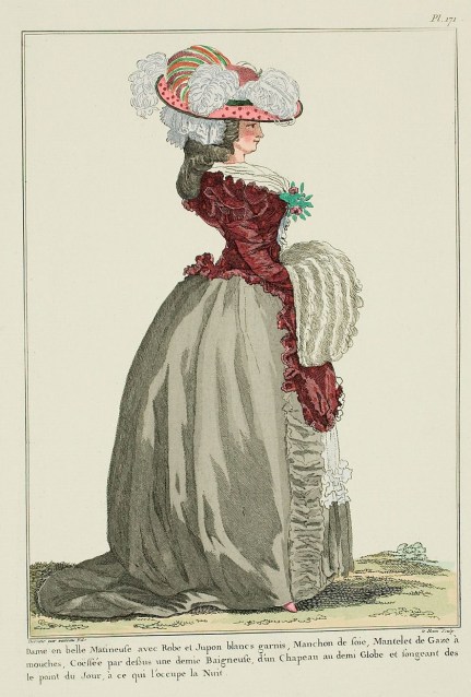 “On the method by which women draped their mantelets, the Journal de Paris of February 12 1781 reports a curious anecdote, which it took from the Morning Chronicle. A French gentleman had written to the editor of the latter newspaper that at a ball, in London, he had found on land ‘a woman’s cloak, of black taffeta, lined with the same and edged with lace.’ And he added maliciously: ‘measuring, carefully, the length between the top of the cloak, in the back, and the pleats or horizontal crumpling formed around the bottom of the waist, by the force of the cloak when the person tightens it in the French manner to elevate her stature and when she gathers the whole upper part at the hips while the lower part, trimmed with lace, falls and floats with softness over a rounded and strongly pronounced croupe*, there is not a single admirer who hadn’t decided, as I made it, that the bust being soaring, the person is tall and well made …”