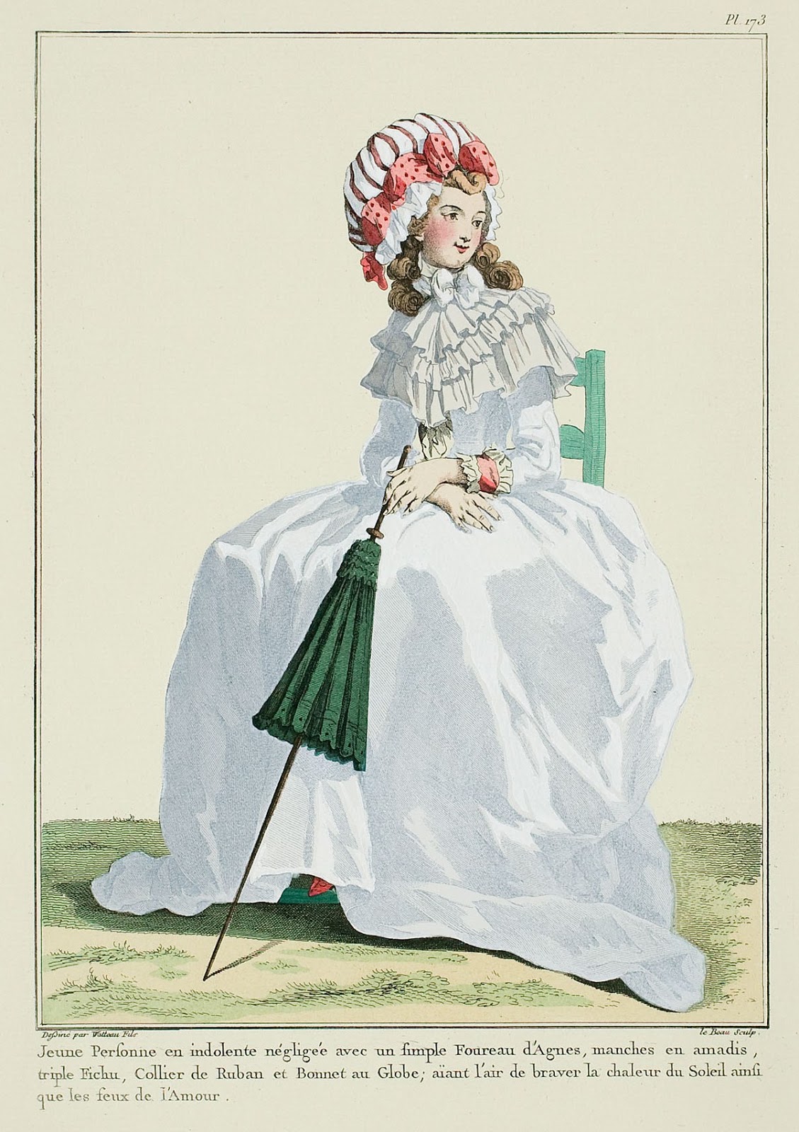 Young Person in indolent négligée with a simple Fourreau d’Agnes, amadis sleeves, triple Kerchief, Ribbon Necklace, and Globe Cap; having an air of braving the heat of the Sun as much as the fires of Love. (1784)