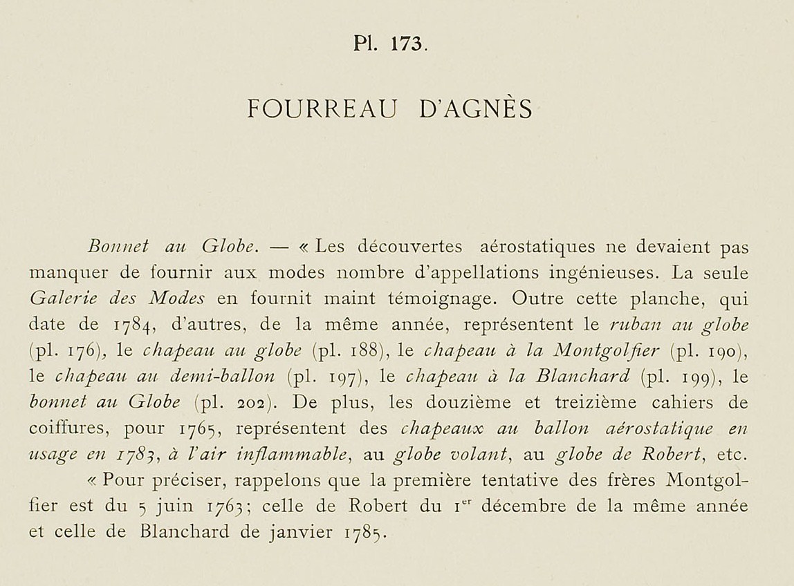 Globe Cap. – “The aerostatic discoveries did not fail to furnish a number of ingenious names for fashions. The Galerie des Modes alone provides much evidence of this. In addition to this plate, which dates to 1784, others from the same year show the globe ribbon (pl. 176), the globe hat (pl. 188), the hat à la Montgolfier (pl. 190), the demi-balloon hat (pl. 197), the hat à la Blanchard (pl. 199), the Globe cap (pl. 202). Furthermore, the twelfth and thirteenth books of coiffures, for [1785], show the aerostatic balloon hats worn in 1783, à la inflammable air, au flying globe, au Robert’s globe, etc.