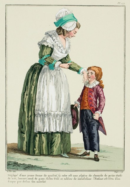 “We deign to regard with reflection these marionettes that are seen in our promenades, to prelude with silliness the errors of the rest of their lives. The little gentleman, in a cloth suit, and the little lady, coiffed in the manner of the great ladies, copying, under the auspices of a stupid nursemaid, the originals that they will be one day. All the grimaces and the affectation of the petit maître are gathered together in the little gentleman. He is applauded, caressed, admired in proportion to the contortions he makes. The little lady receives a compliment for each simper which she advises herself to make and if her precocious address give her some power over the little husband, it augurs, with a stupid surprise, the interesting role that she will play in Society.”