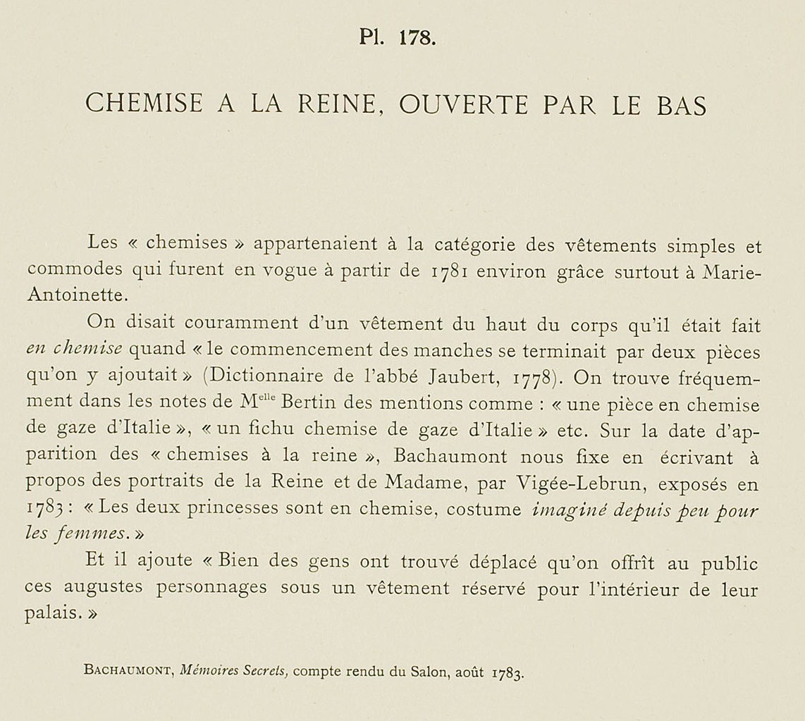 At the time, one said that an upper-body garment was made en chemise when “the beginning of the sleeves ended in two pieces which were added” (Dictionary of the abbé Jaubert, 1778). One frequently finds in the notes of Mlle Bertin mentions such as “a piece en chemise of Italian gauze”, “a fichu-chemise* of Italian gauze”, etc. On the date of the appearance of the “chemises à la reine“, Bachaumont fixes it for us in writing about the portraits of the Queen and Madame, by Vigée-Lebrun, shown in 1783: “The two princesses are en chemise, a costume invented recently for women.”