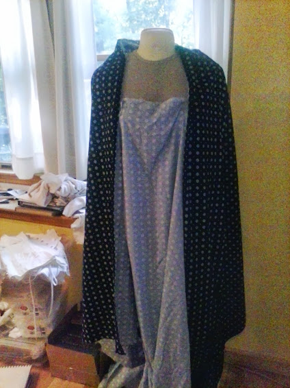 In theory, but I don't have any white, I think. The photo isn't exactly what I'm aiming for – I've seen a few pattern drawings with those side panels that look like the curve up under the base skirt, and I have no idea what the deal is there – but, you know, the general look with a center panel and elbow-length sleeves and stuff at the sides of the skirt. But I like the dark fabric so much, I want to use it!