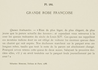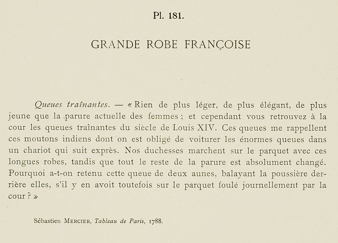 Long trains. – “There is nothing lighter, more elegant, newer than what women wear now; and yet you found long trains at court in Louis XIV’s time. These trains remind me of Indian sheep which are driven in enormous trains by a chariot which follows behind them. Our duchesses walk on the floor with these long gowns, while all the rest of the outfit is absolutely changed. Why do we retain this train, two ells long, sweeping the dust behind them, if there had been dust on the daily-crowded floor of the court?”
