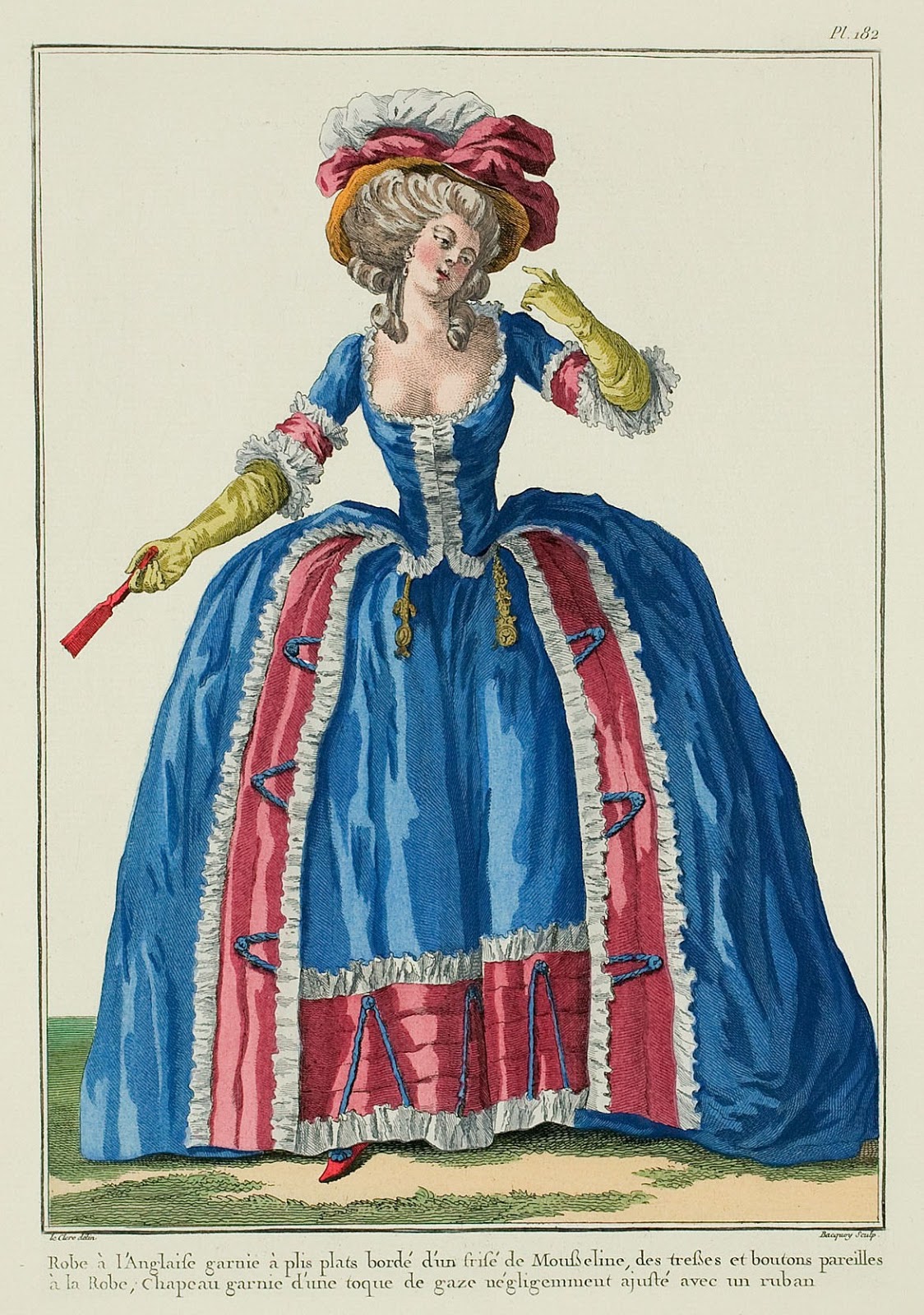 Robe à l’Anglaise trimmed with knife pleats edged with a Muslin frill, with cords and buttons matching the Gown, Hat trimmed with a gauze toque negligently fitted with a ribbon. (1784)