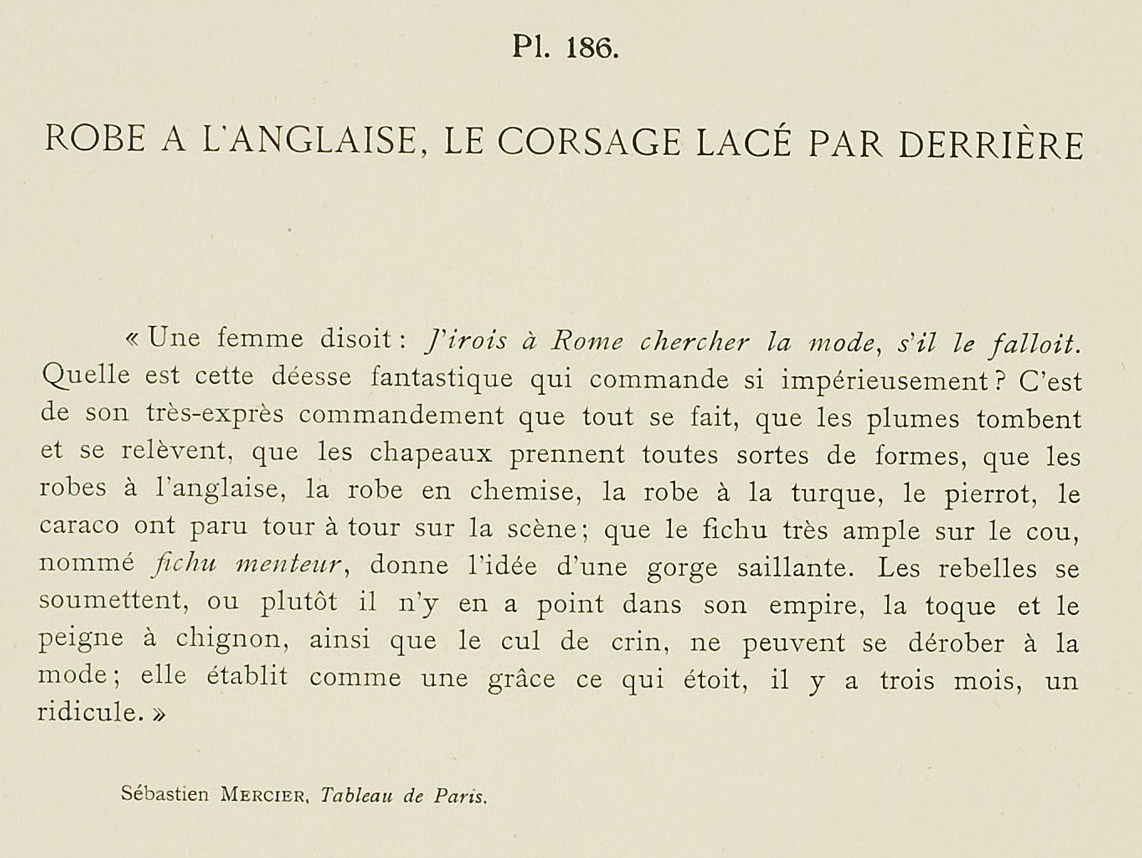 “A woman said: I would go to Rome to seek fashion, if it were required.  What is this fantastic goddess who commands so imperiously?  It is at her very express desire that everything is done, that plumes fall and rise, that hats take all sorts of forms, that the robes à l’anglaise, the chemise gown, the robe à la turque, the pierrot, the caraco have appeared alternately on the scene: that the kerchief that is very full on the neck, called the deceitful kerchief, gave the idea of a protruding throat.  Rebels submitted, or rather there were none in fashion’s empire, for the toque and the chignon comb, together with the horsehair cul, could not be escaped in fashion; she gracefully established what was, three months ago, ridiculous.”