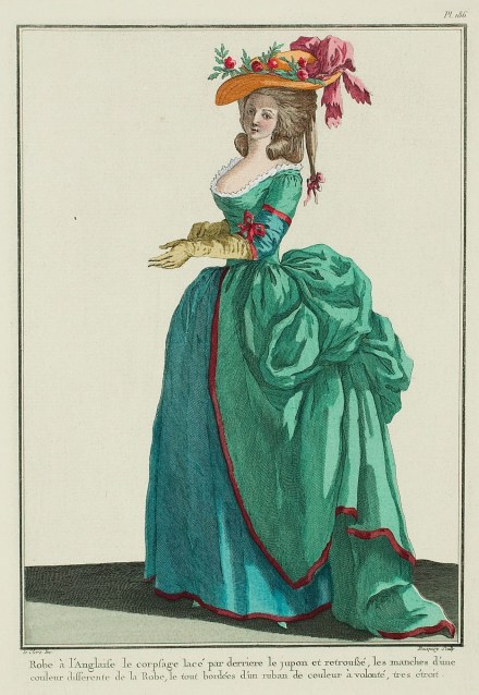 Robe à l’Anglaise, the bodice laced in the back, the skirt is tucked up,* the sleeves of a color different from that of the Gown, the whole edged with a very narrow ribbon of any desired color. (1784)