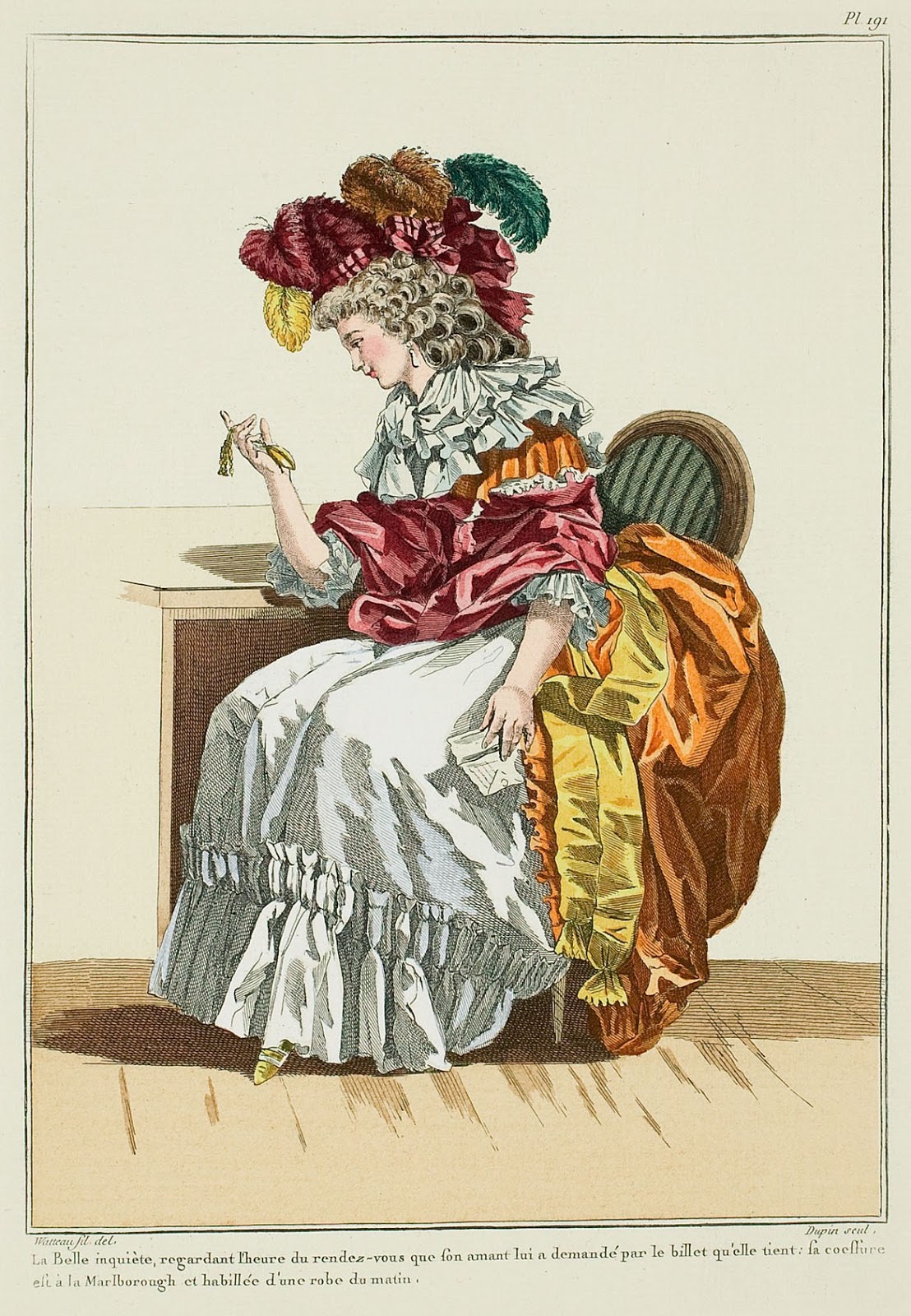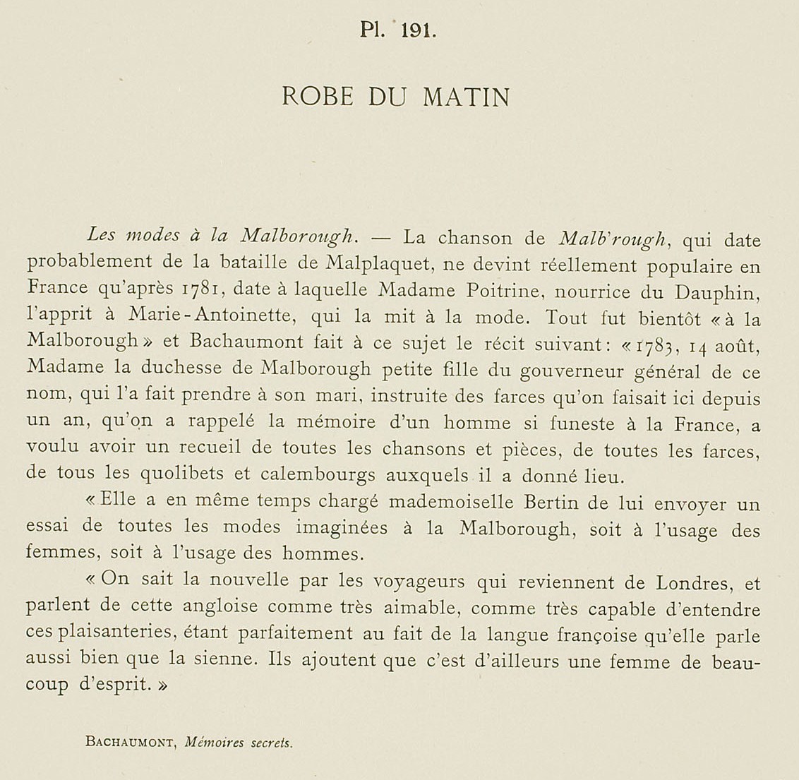 The Marlborough fashions. – The song Marlborough, probably dating to the battle of Malplaquet, became truly popular in France after 1781, the date on which Madame Poitrine [Chest], nurse to the Dauphin, taught it to Marie Antoinette, who made it fashionable. Everything was soon “à la Marlborough” and Bachaumont made it the subject of the following: “1783, August 14, Madame the duchess of Malborough, grand-daughter of the governor-general of that name, who took him as her husband, learned in the jokes that were made here since last year, when the memory of a man so fatal to France was recalled, wanted to have a collection of all the songs and plays, of all the jokes, of all the jeers and puns that have resulted.