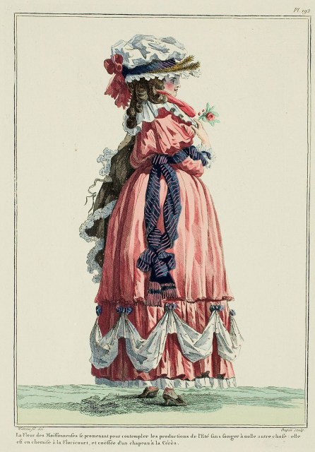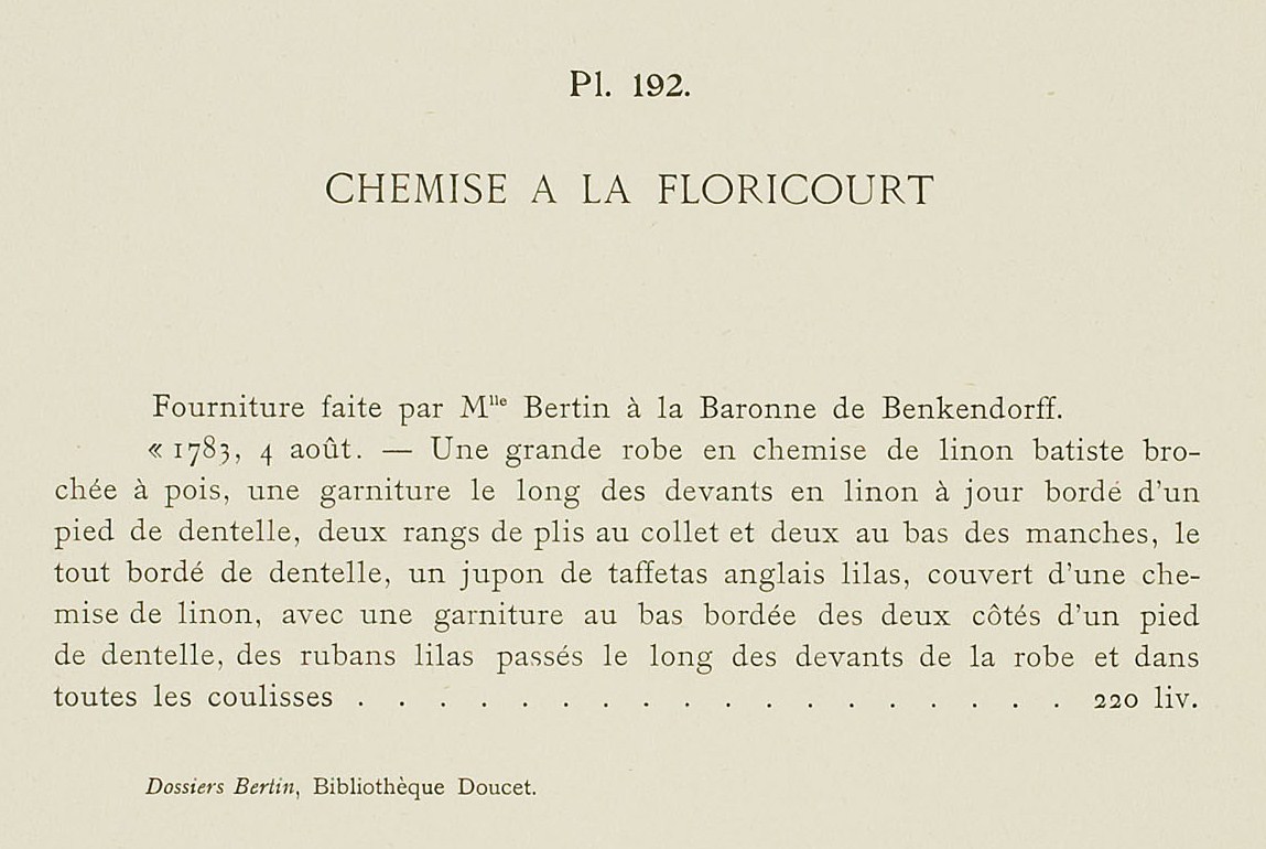 “1783, August 4. – A grand robe en chemise of spotted linen batiste, a trimming along the fronts in stylish linen edged with a row of lace, two rows of pleated ruffles around the collar and two at the bottom of the sleeves, the whole edged with lace, a petticoat of English lilac taffeta, covered with a chemise of linen, with a trimming at the bottom edged on two sides with a row of lace, lilac ribbons along the front pieces of the gown and in all the drawstring channels. 220 livres.