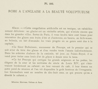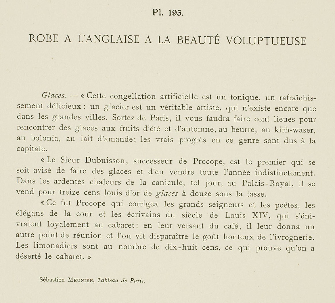 “Sieur Duboisson, successor to Procope, is the best who is advised to make ices and sell them all year round. In the ardent heat of the dog days, at the Palais-Royal, he sells ices for thirteen hundred louis d’or per dozen in cups.