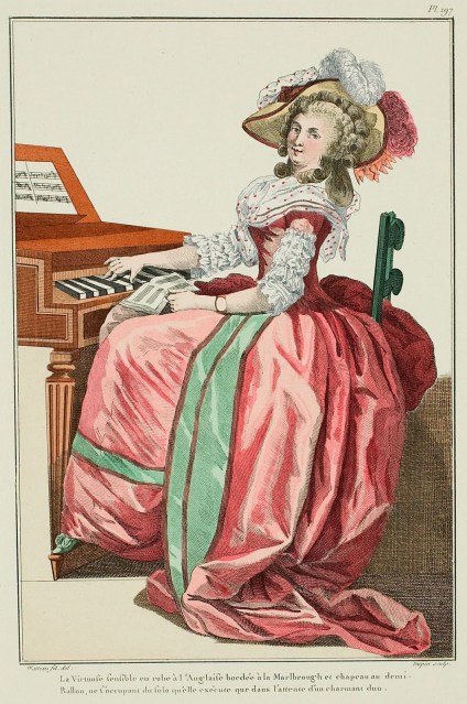 The sensitive Virtuous woman in a robe à l’Anglaise bordered à la Marlborough and in a demi-Balloon hat, only busying herself alone she executes in waiting for a charming duo. (1784)