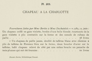 Accessories made by Mme Bertin for Mme Duchatelet. – “1785, 15 June: A hat topped with violet gauze, edged with a beautiful blonde lace; storms of the violet gauze in contrary pleats on the crown and knots of straw ribbons … 78 livres.