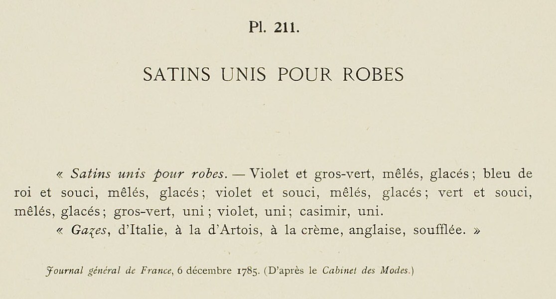 “Plain satins for gowns. – Violet and grape-green, mixed, glazed; violet and marigold, mixed, glazed; green and marigold, mixed, glazed; grape-green, plain; cashmere, plain.