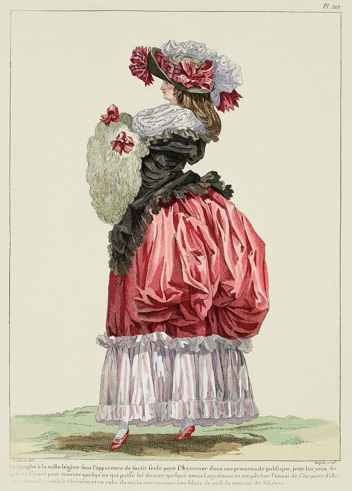 The Nymph of slight size, with the appearance of going out alone to winter herself in a public promenade, throws her eyes from side to side to find someone who could give her some new charm and prevent boredom from seizing her. She is in a hat à la Cherubin* and a morning dress with a white muff of Siberian sheeps’ wool. (1785)
